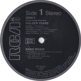 David Bowie: Golden Years (RCA PD84792; Germany 1984) Format: CD Release notes: disc made in Japan (combination original) Tracks: Fashion / Red Sails / Look Back in Anger / I Can't Explain / Ashes to Ashes / Golden Years / Joe the Lion / Scary Monsters (and Super Creeps) / Wild Is the Wind Other notes: CD re-issue of 1983 album |