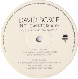 David Bowie: In the White Room - The Classic 1995 Transmission (Parachute PARA484LPLTD; EU 06/2022) Format: 2LP Release notes: bootleg, clear vinyl, FOC, sticker on shrinkwrap, limited edition Tracks: introduction / Look Back in Anger / The Hearts Filthy Lesson // The Voyeur of Utter Destruction (as Beauty) / Under Pressure (take 1) / Under Pressure (take 2) // Hallo Spaceboy / Boys Keep Swinging / Jump They Say // We Prick You / The Man Who Sold the World / Teenage Wildlife Other notes: live, Westway Studios, London, 14/12/1995, recorded for radio broadcast