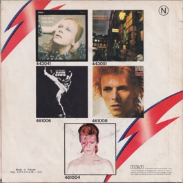 David Bowie: The Rise and Fall of Ziggy Stardust and the Spiders from Mars (RCA 443051; France 1972) Format: LP Release notes: no MainMan credits, price code "U" Tracks: see UK issue Collector's notes: This French pressing has no MainMan credits (like early UK pressings), but this seems to be a general feature of French releases of the album. This copy is an early (possibly first) pressing, identifiable by its label design (which doesn't have text running along the label margin) and the price code "U" - pressings from the late 1970s typically have the price code "RC 250". |