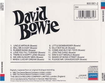 David Bowie: Hunky Dory (RCA PD84623; Germany 1984) Format: CD Release notes: "Made in Germany" on disc, jewel case with booklet and back inlay Tracks: Changes / Oh! You Pretty Things / Eight Line Poem / Life on Mars? / Kooks / Quicksand / Fill Your Heart / Andy Warhol / Song for Bob Dylan / Queen Bitch / The Bewlay Brothers Other notes: CD re-issue of 1971 album