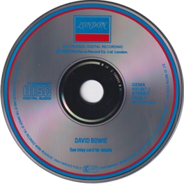 David Bowie: Fame and Fashion (David Bowie's All Time Greatest Hits) (RCA PD84919; Germany 1984) Format: CD Release notes: no country of manufacture on disc, jewel case with fold-out insert and back inlay Tracks: Space Oddity / Changes / Starman / 1984 / Young Americans / Fame / Golden Years / TVC 15 / "Heroes" (long English version) / D.J. / Fashion / Ashes to Ashes Other notes: all tracks album versions; CD re-issue of 1984 album Collector's notes: Note that this CD is a bit unusual in that it neither states the country of manufacture, nor the copyright society on the disc. |